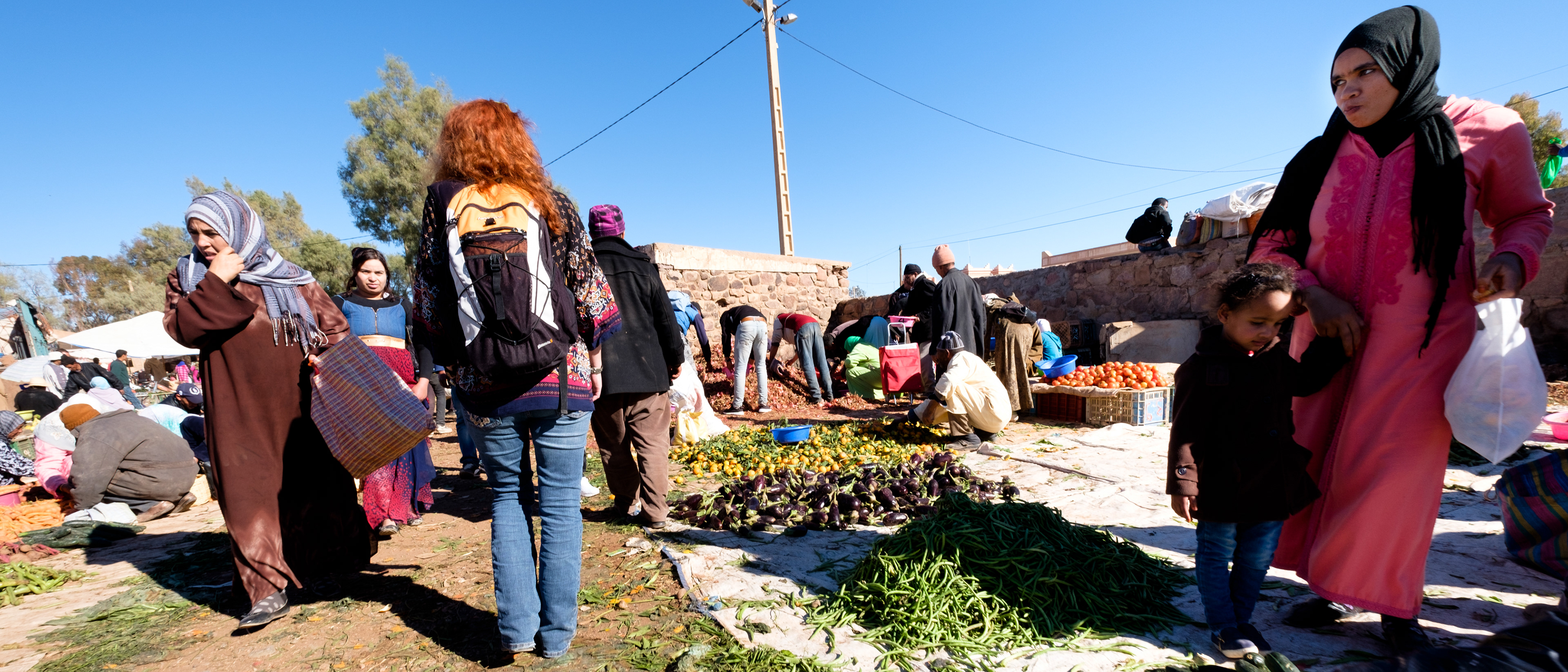 In Skoura, einer Oase die überwiegend von Berbern bewohnt wird, ist großer Markt. Es herrscht reges Treiben. Viele Händler sind aus den umliegenden Bergen angereist und bieten ihre Waren an. Es wird alles angeboten, was man zum Leben hier oben braucht. Von der Kunststoff-Wasserflasche bis zum gebrauchten Motorradreifen ist alles zu finden. Vor allem aber Gemüse, Gewürze und Kleidung. Auch hier pulsiert des Leben förmlich. Jeder ist mit jedem im Gespräch. Es wird gelacht, gehandelt, Hände geschüttelt und gerdet. Eine unglaublich dichte, dynamische und gleichzeitig gelassene Athmosphäre herrscht hier zwischen den Menschen. Wir lassen uns durch die Gänge treiben und genießen die Düfte, die um unsere Nasen wehen.