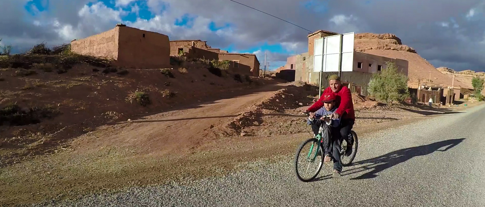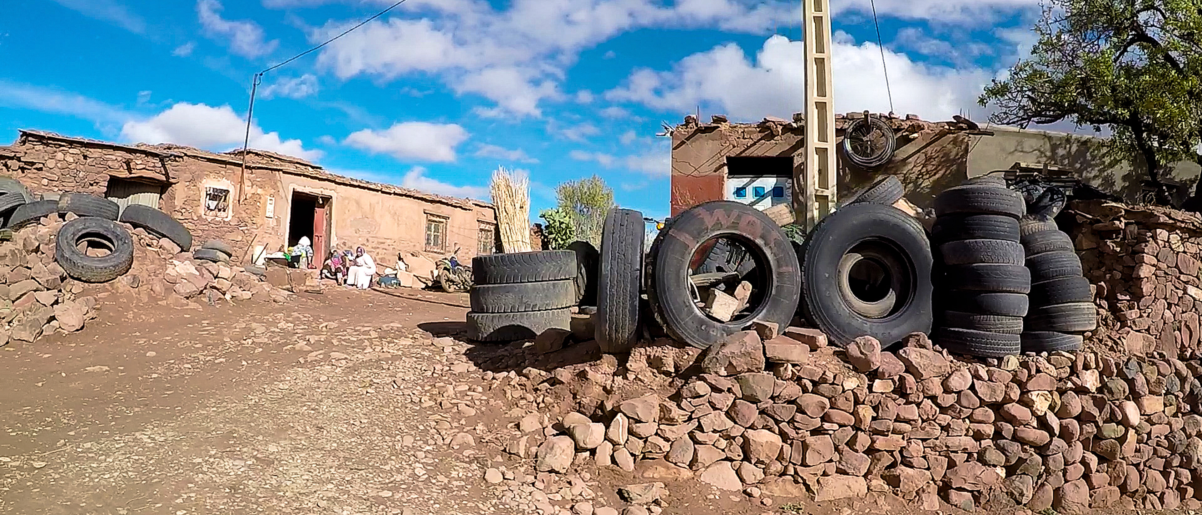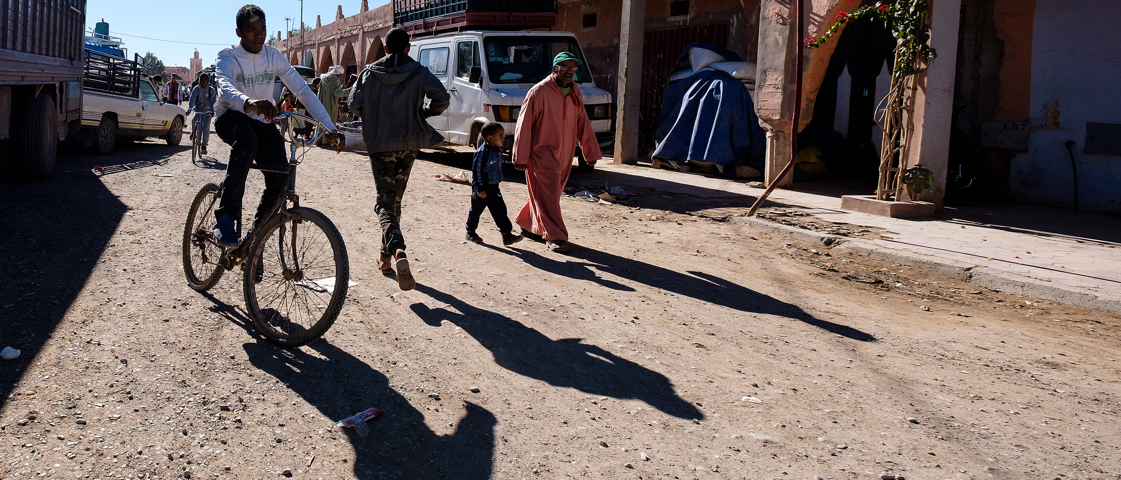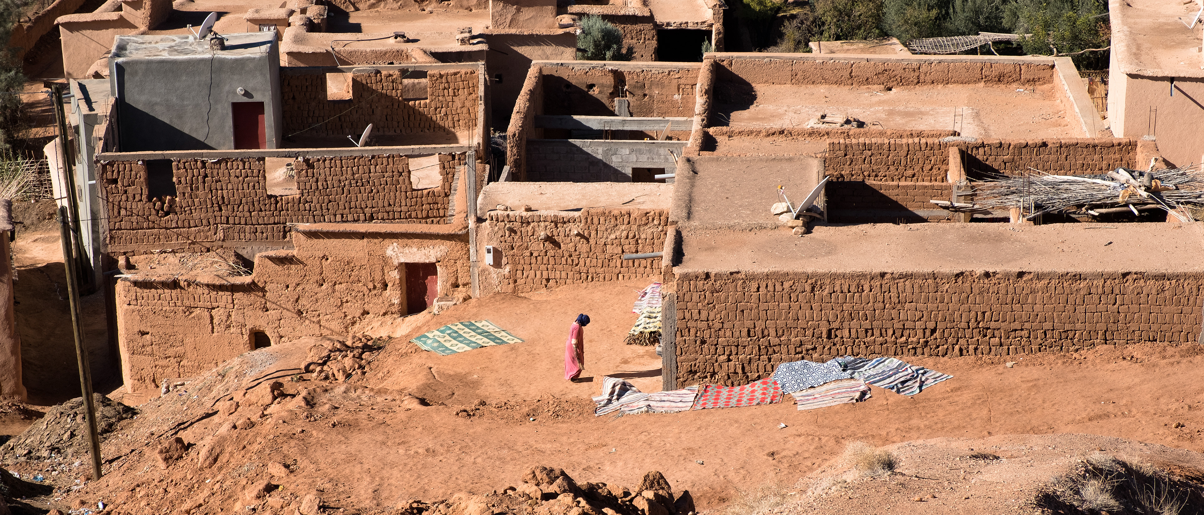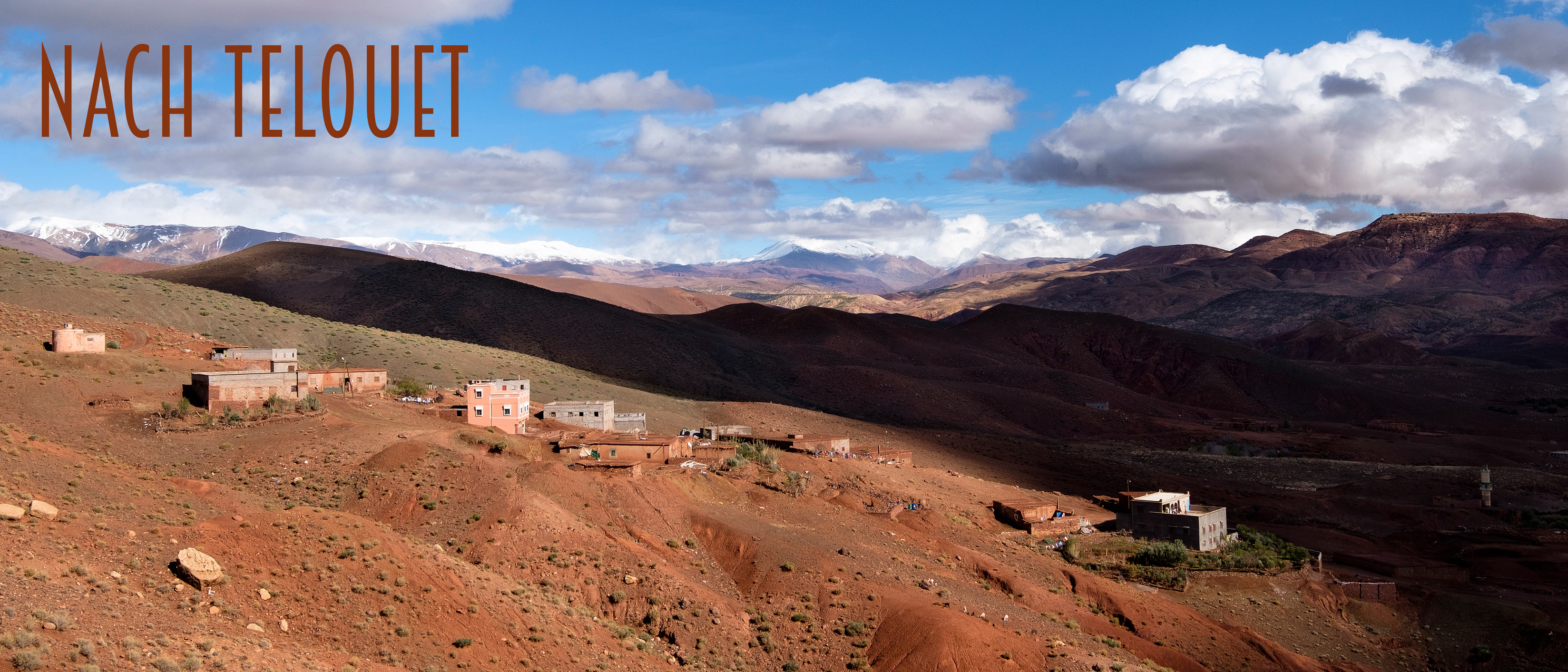 Wir stoppen für eine kurze Rast. In der Ferne erheben sich die schneebedeckten Gipfel des hohen Atlas. Die kleine Siedlung liegt wie ausgestorben vor uns. Nur der Muezzin, der vom nahen Minarett aus seinen Gesang anstimmt, durchbricht die erhabene Stille.