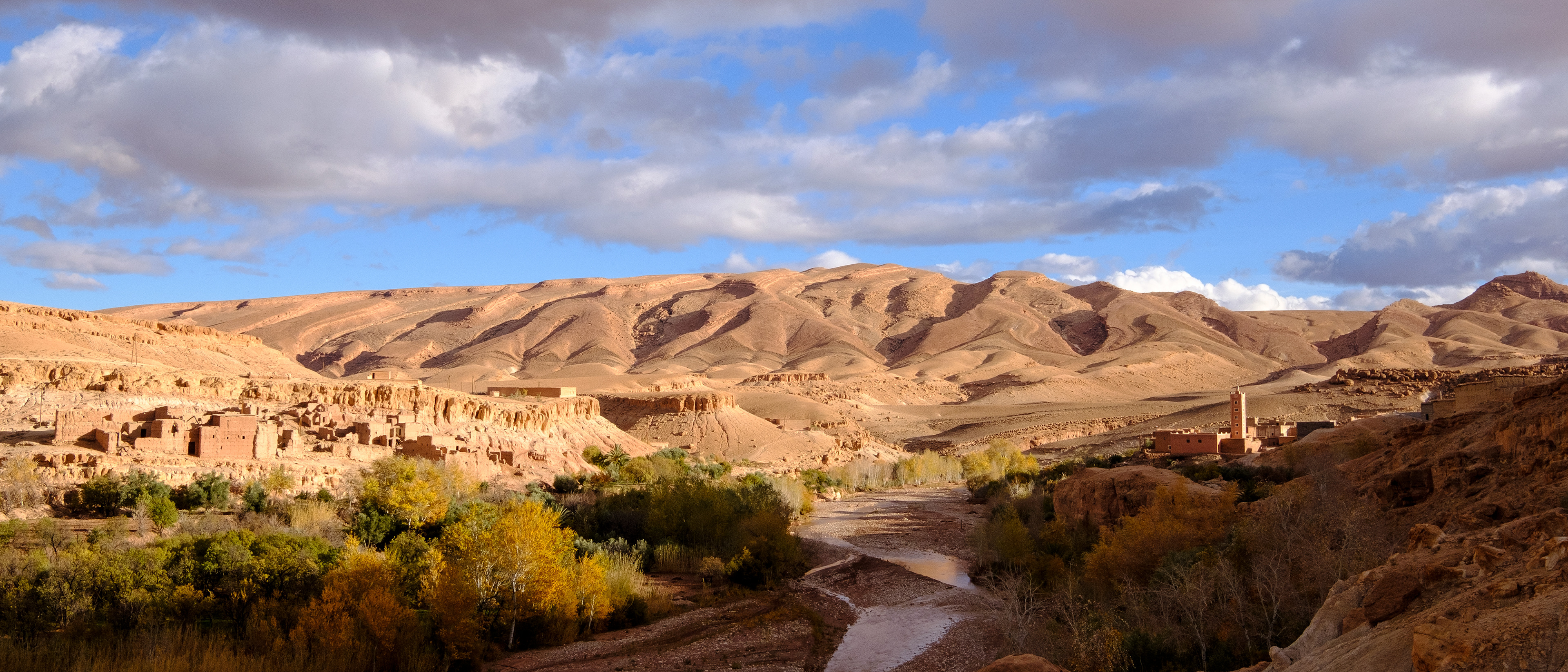 Telouet, wie auch die höchsten Berge des Atlas liegen hinter uns und die Piste schwenkt auf südlichen Kurs. Sie folgt einem Flußlauf, der sich bald durch ein fruchtbares und palmengesäumtes Tal abwärts schlängelt. Wir stoppen nur kurz. Der Weg ist noch weit bis Skoura und es warten noch zahlreiche, große „Augenöffner“ auf uns.